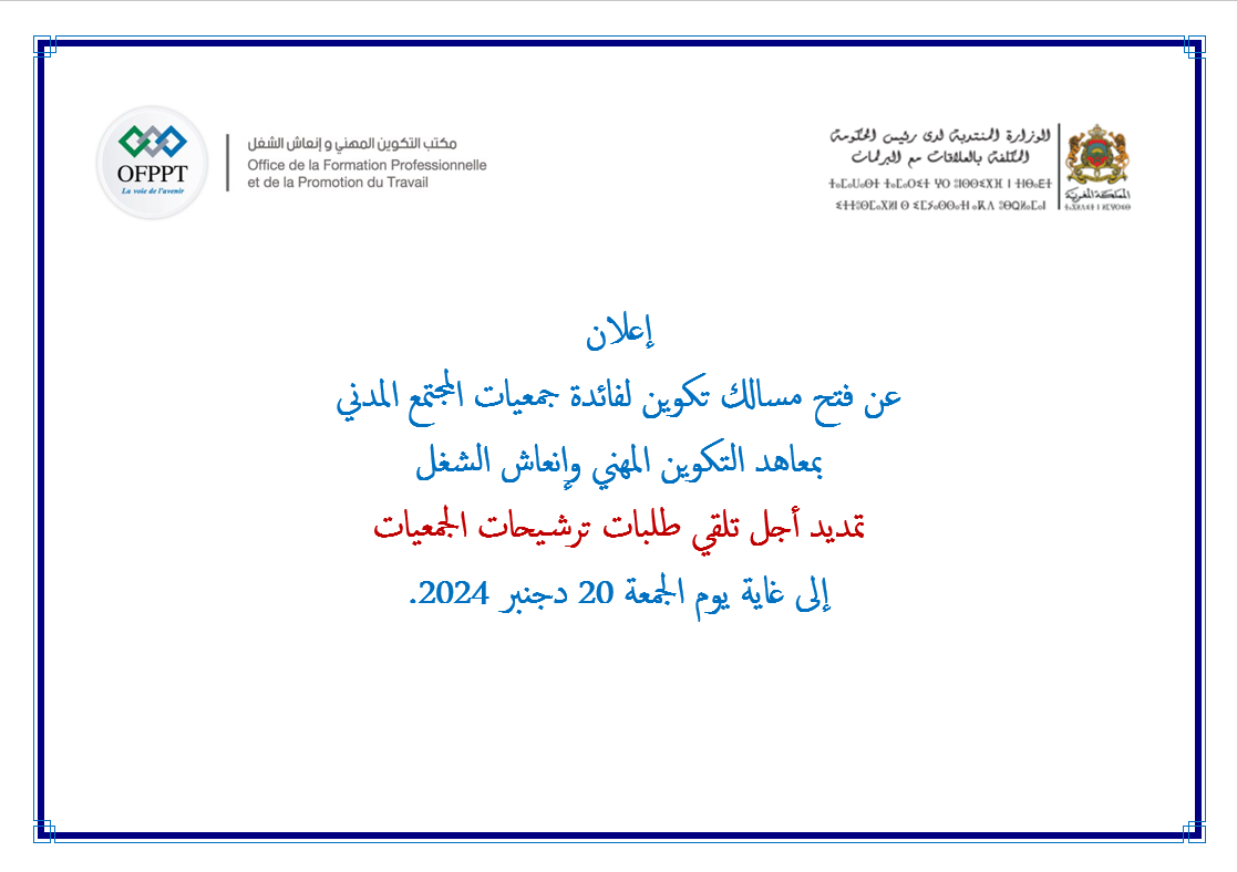 إعلان 2 عن فتح مسالك تكوين لفائدة جمعيات المجتمع المدني بمعاهد التكوين المهني وإنعاش الشغل تمديد أجل تلقي طلبات ترشيحات الجمعيات