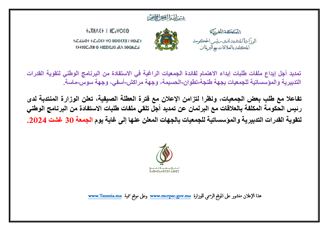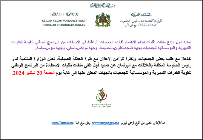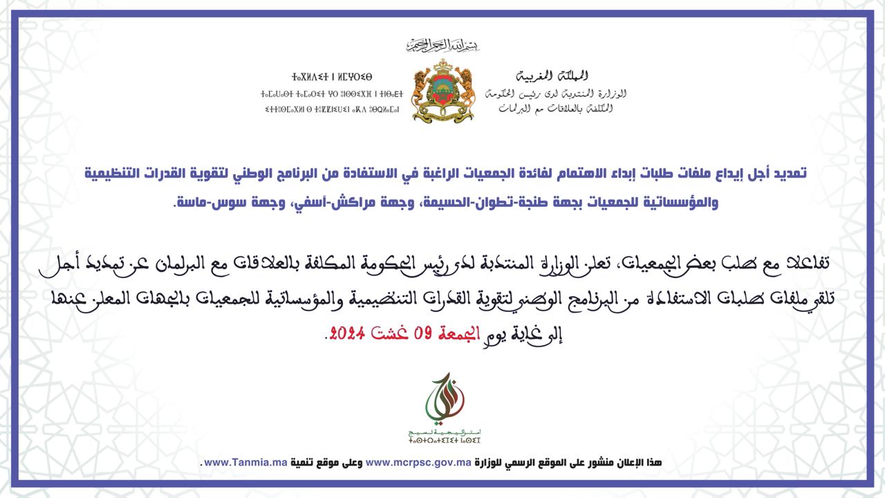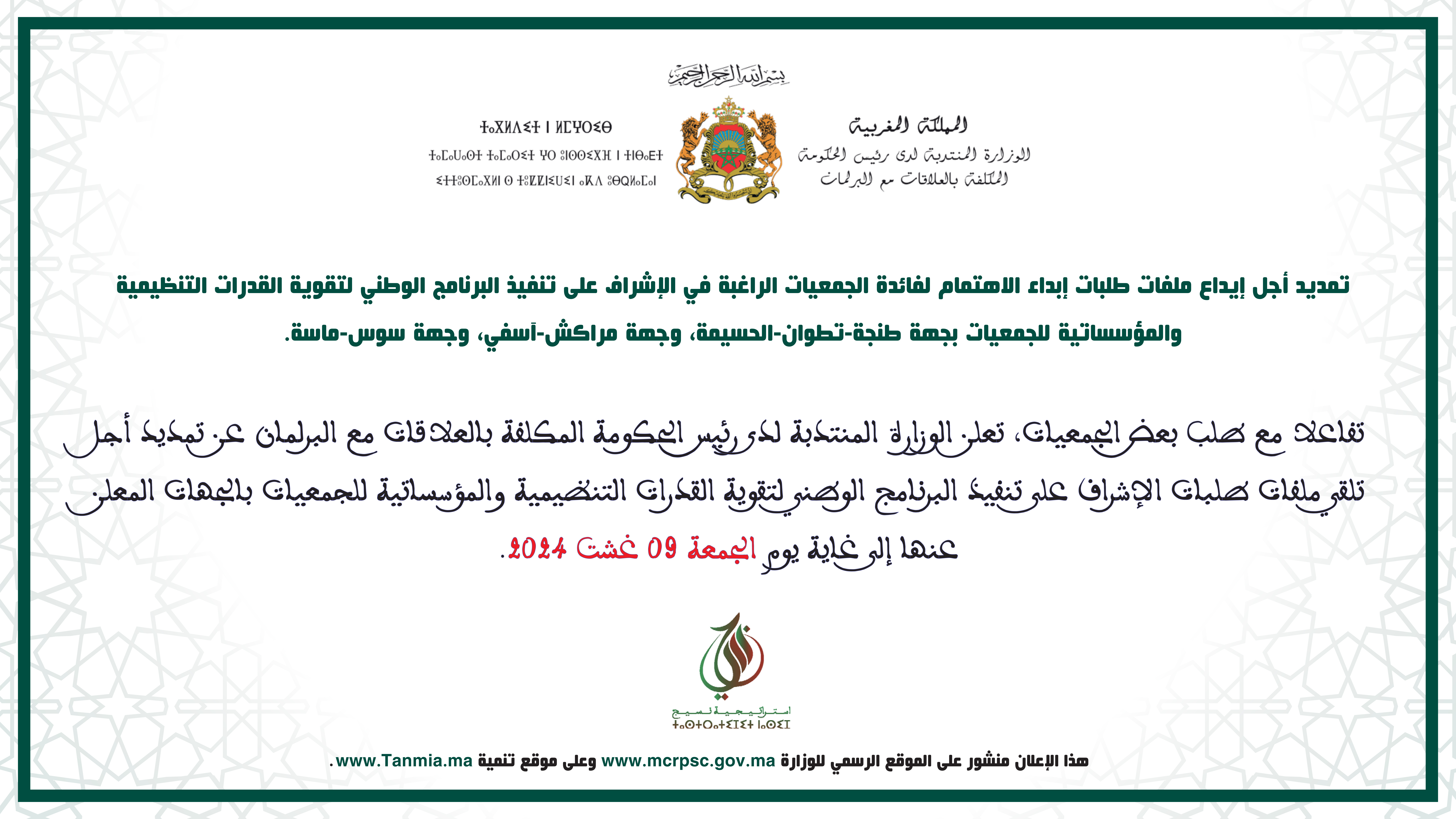 تفاعلا مع طلب بعض الجمعيات، تعلن الوزارة المنتدبة لدى رئيس الحكومة المكلفة بالعلاقات مع البرلمان عن تمديد أجل تلقي ملفات طلبات الإ