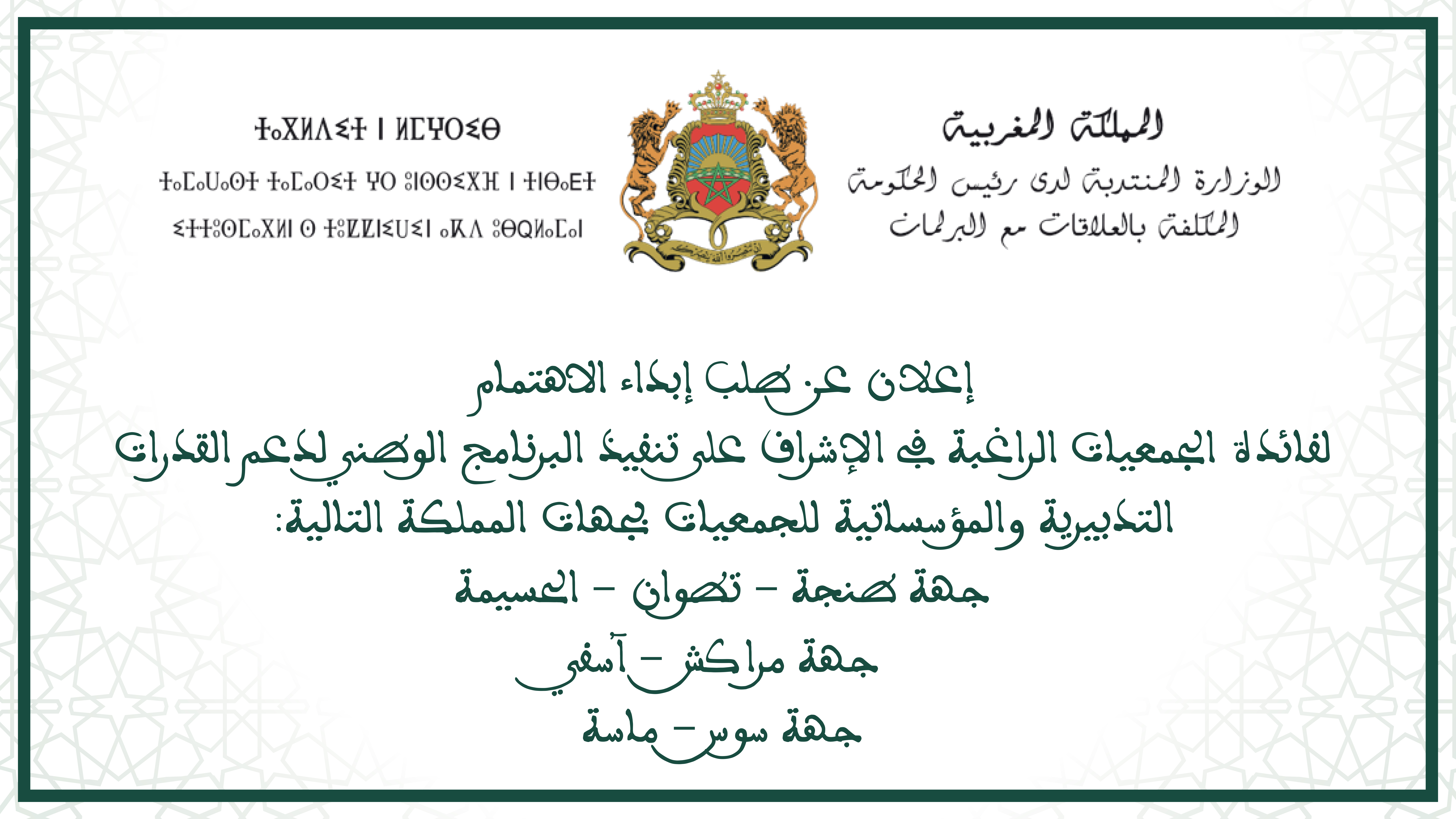 إعلان عن طلب إبداء الاهتمام لفائدة الجمعيات الراغبة في الإشراف على تنفيذ البرنامج الوطني لدعم القدرات التدبيرية والمؤسساتية للجمعيات بجهات المملكة التالية: جهة طنجة - تطوان - الحسيمة جهة مراكش - آسفي جهة سوس - ماسة
