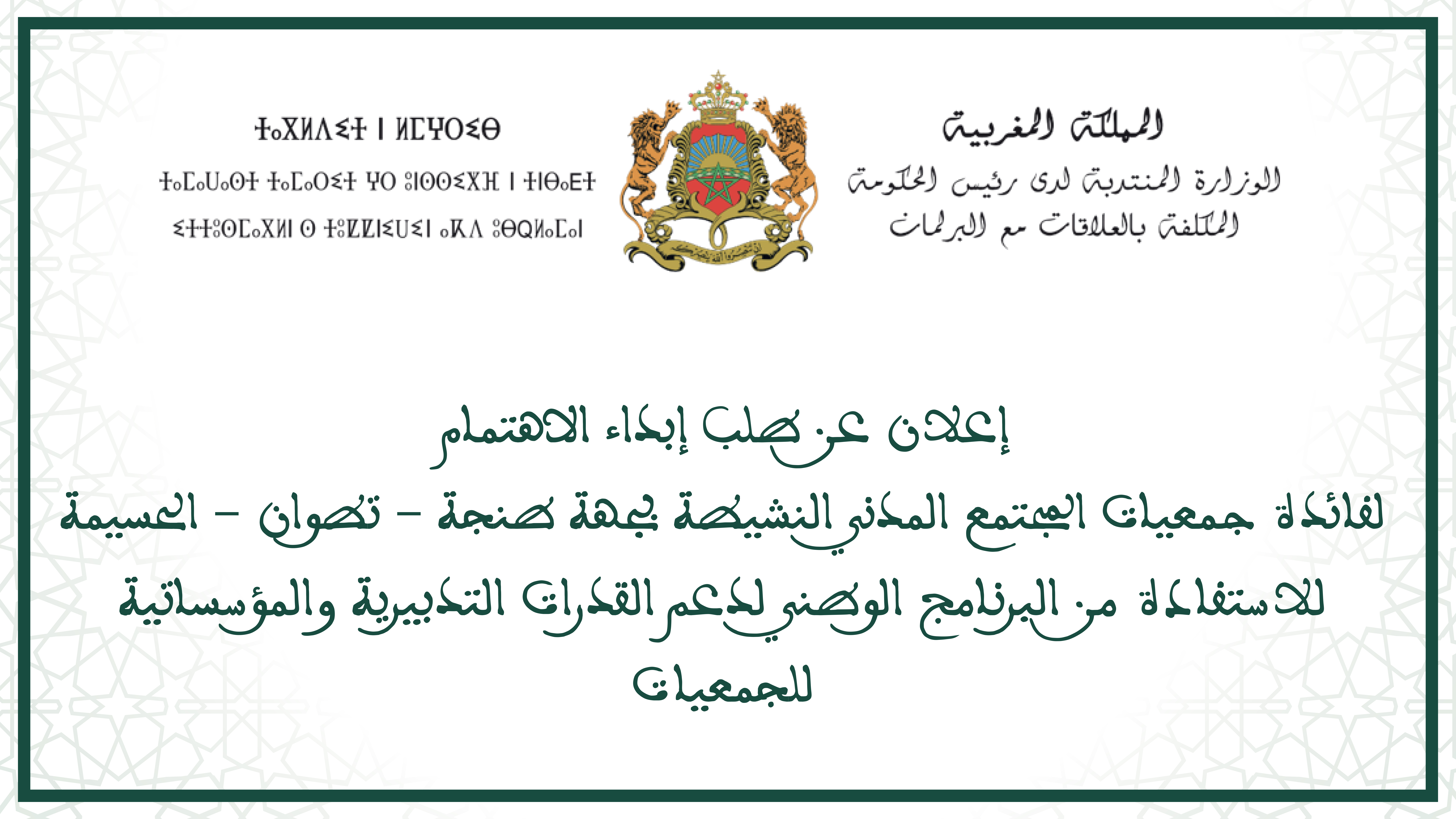 إعلان عن طلب إبداء الاهتمام لفائدة جمعيات المجتمع المدني النشيطة بجهة طنجة - تطوان - الحسيمة للاستفادة من البرنامج الوطني لدعم القدرات التدبيرية والمؤسساتية للجمعيات