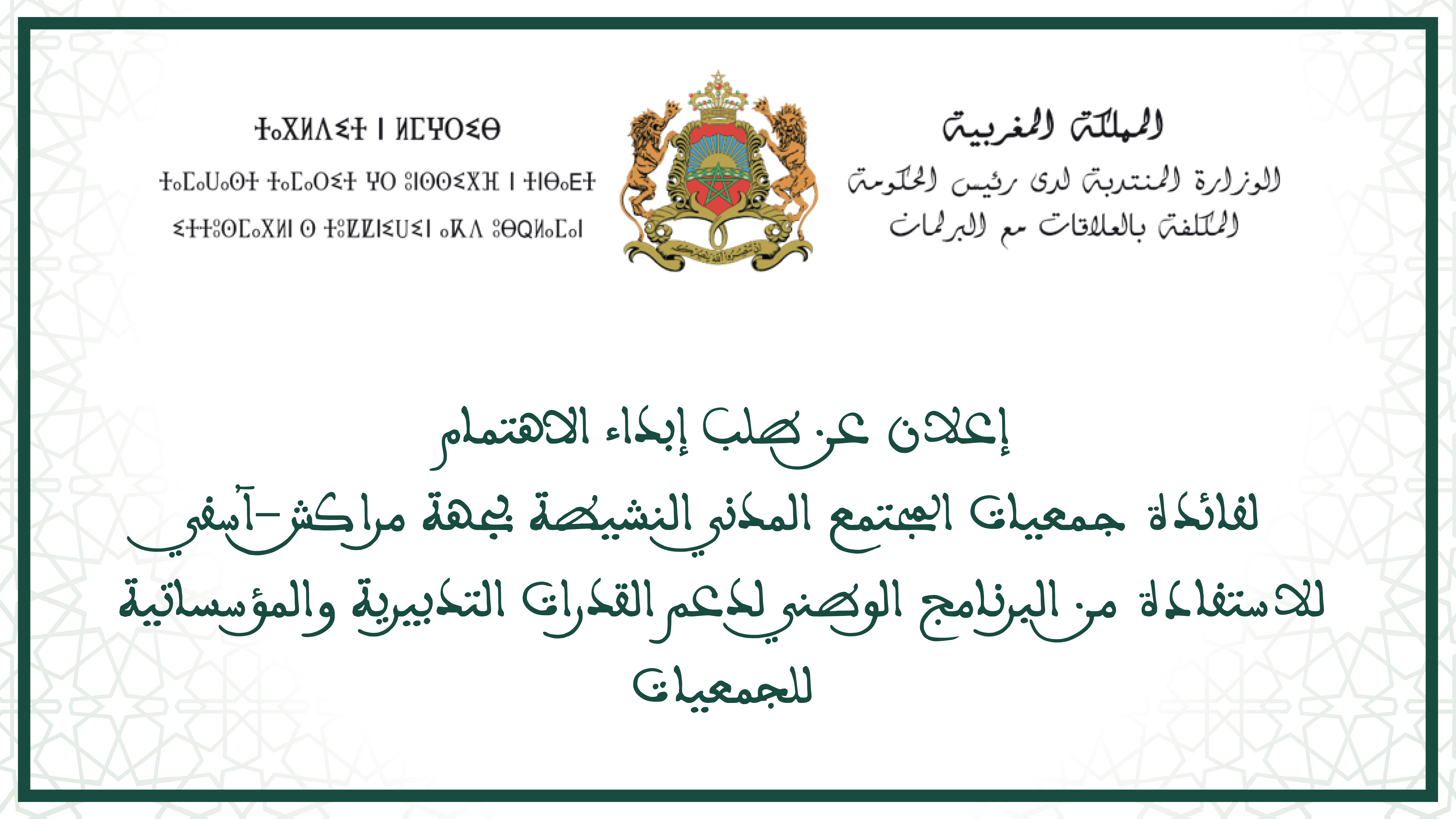 إعلان عن طلب إبداء الاهتمام لفائدة جمعيات المجتمع المدني النشيطة بجهة مراكش-آسفي للاستفادة من البرنامج الوطني لدعم القدرات التدبيرية والمؤسساتية للجمعيات