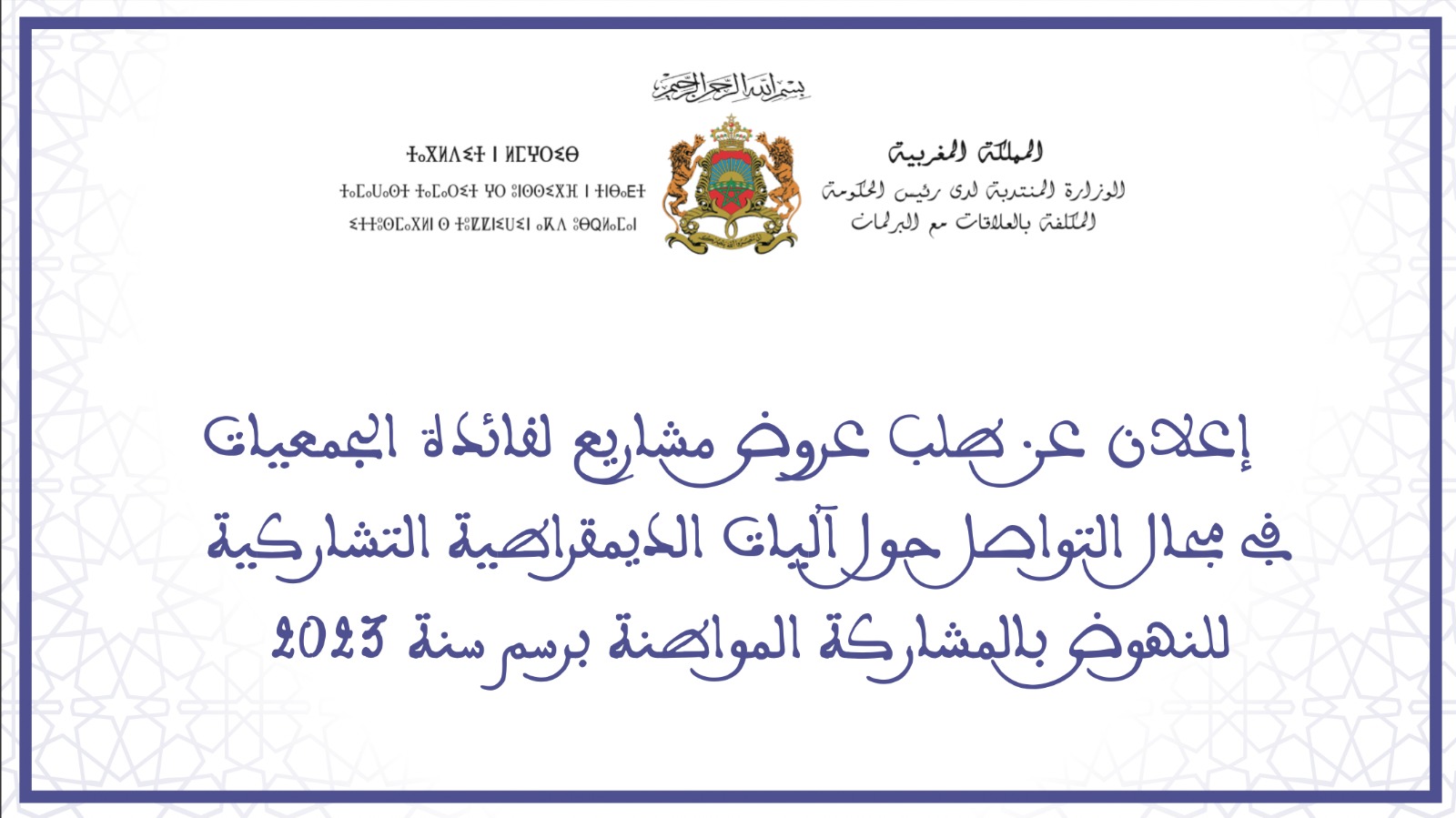 إعلان عن طلب عروض مشاريع لفائدة الجمعيات في مجال التواصل حول آليات الديمقراطية التشاركية للنهوض بالمشاركة المواطنة برسم سنة 2023.