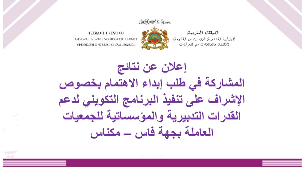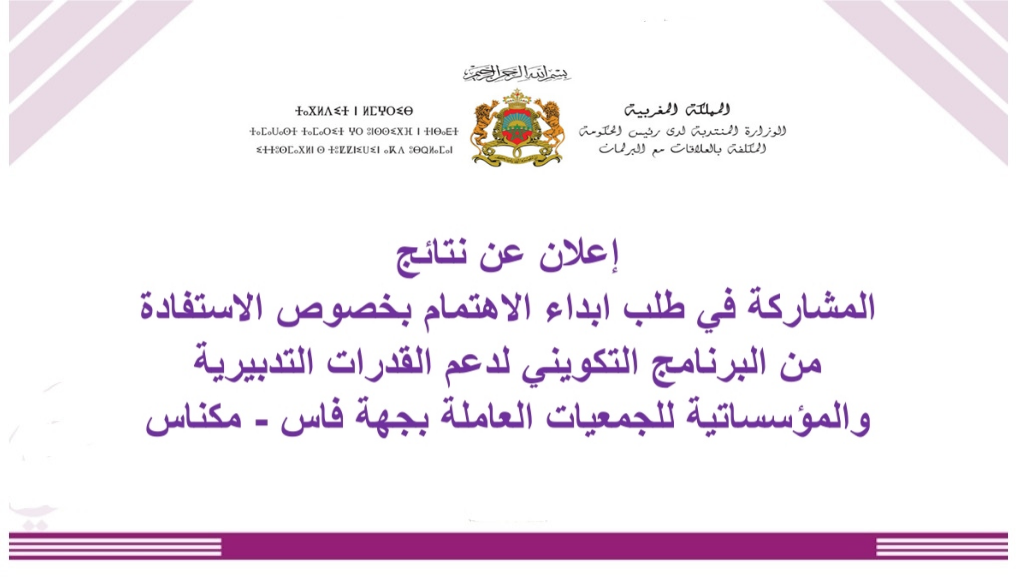 إعلان عن نتائج المشاركة في طلب إبداء الاهتمام بخصوص الإشراف على تنفيذ البرنامج التكويني لدعم القدرات التدبيرية والمؤسساتية للجمعيات العاملة بجهة فاس – مكناس