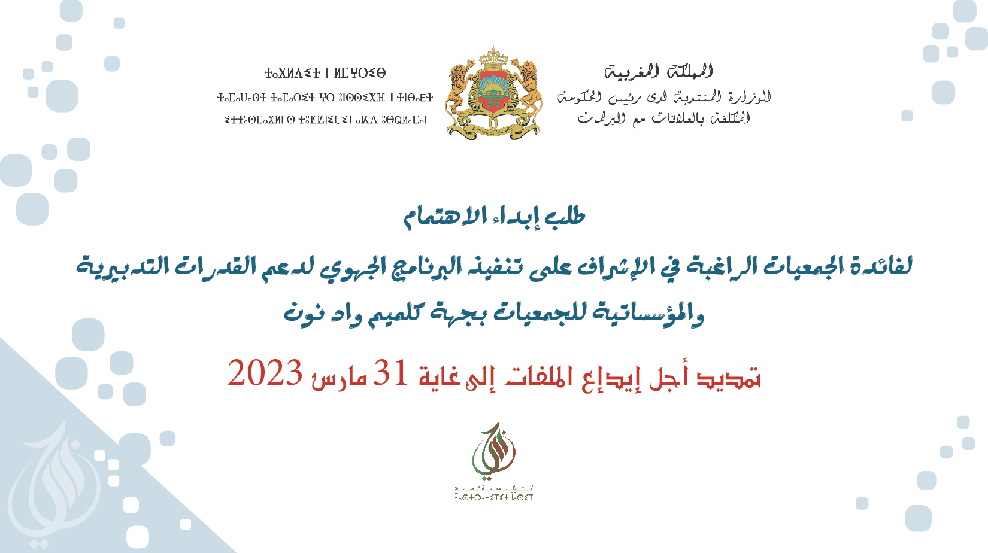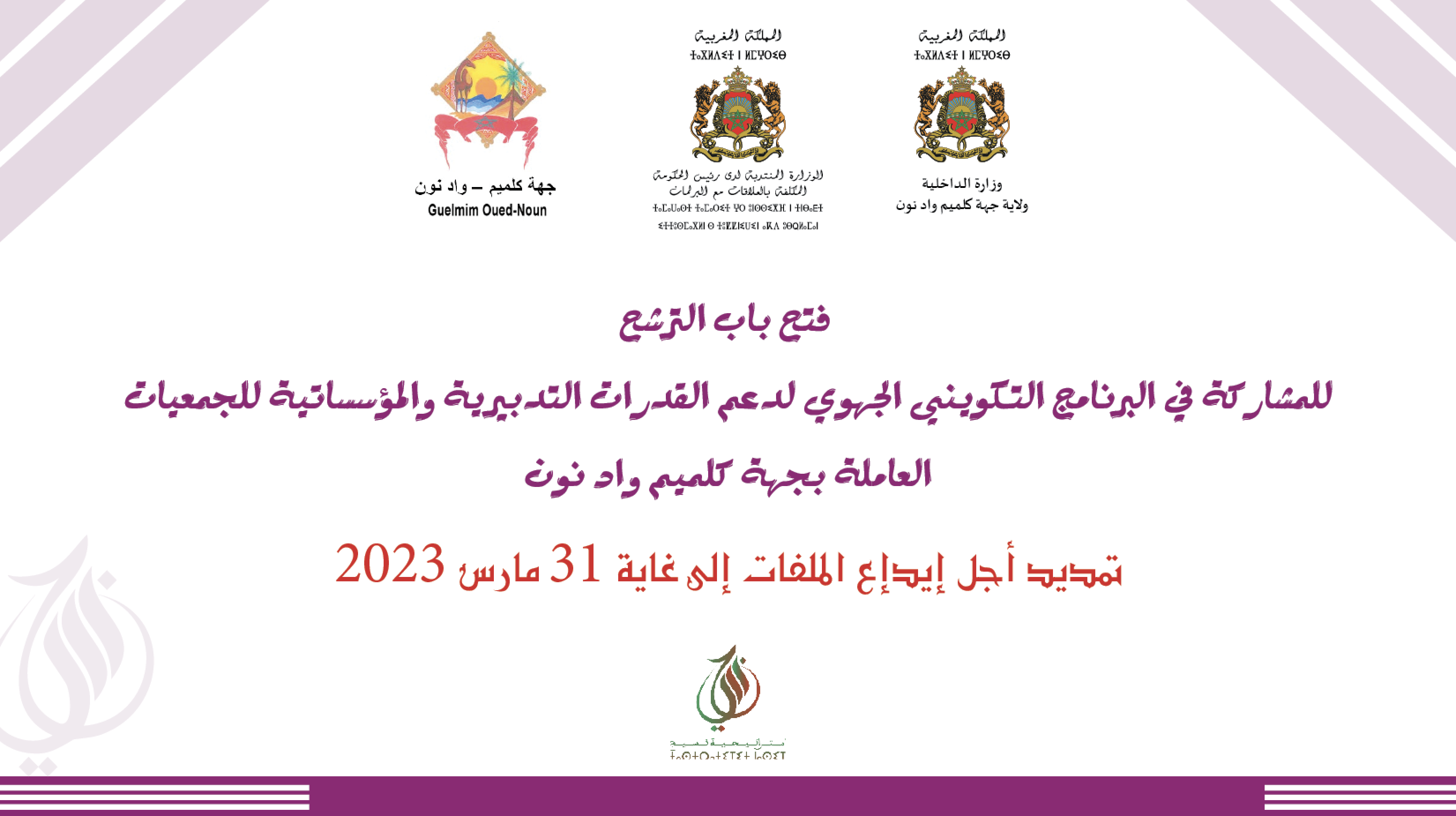 الإعلان عن تمديد طلب إبداء الاهتمام للمشاركة في البرنامج التكويني الجهوي لدعم القدرات التدبيرية والمؤسساتية للجمعيات جهة كلميم واد نون