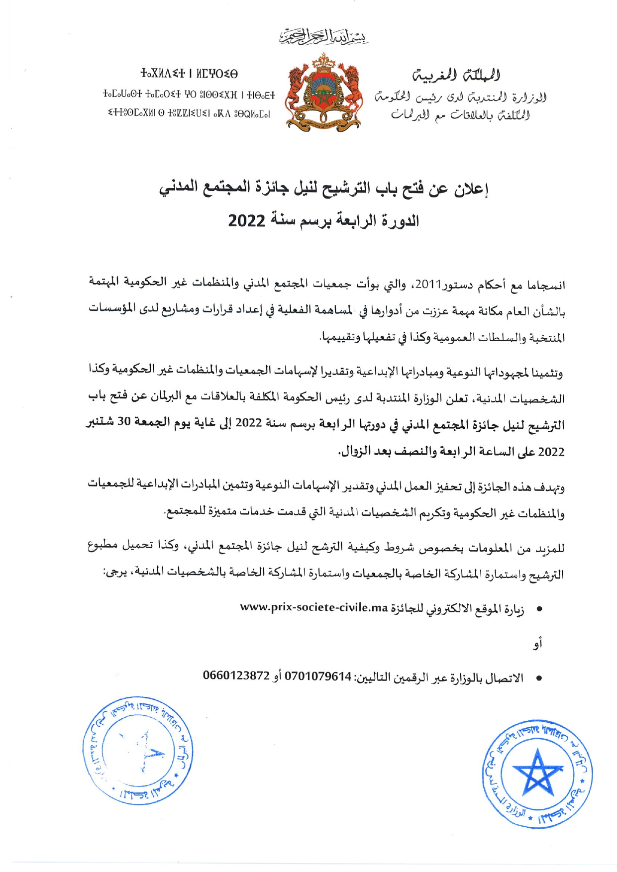 وتثمينا لمجهوداتها النوعية ومبادراتها الإبداعية وتقديرا لإسهامات الجمعيات والمنظمات غير الحكومية وكذا الشخصيات المدنية، تعلن الوزارة المنتدبة لدى رئيس الحكومة المكلفة بالعلاقات مع البرلمان عن فتح باب الترشيح لنيل جائزة المجتمع المدني في دورتها الرابعة برسم سنة 2022 إلى غاية يوم الجمعة 30 شتنبر 2022 على الساعة الرابعة والنصف بعد الزوال.