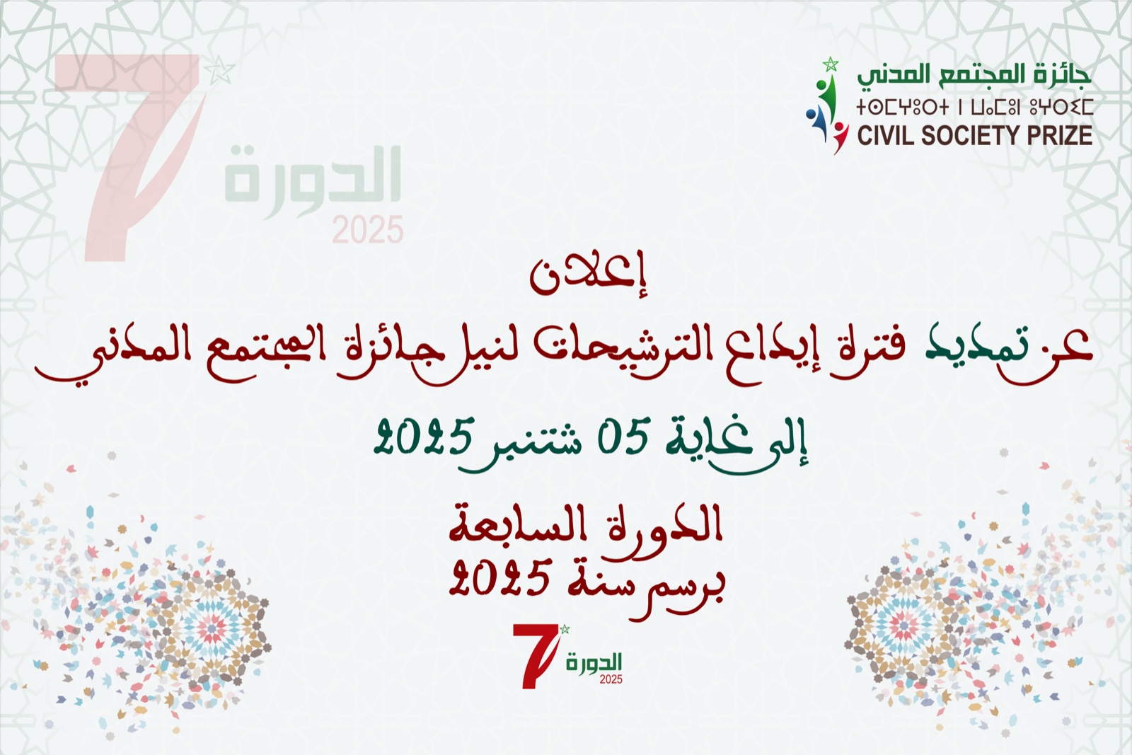 الإعلان عن تمديد فترة تلقي الترشيحات لنيل جائزة المجتمع المدني الدورة السابعة برسم سنة 2025