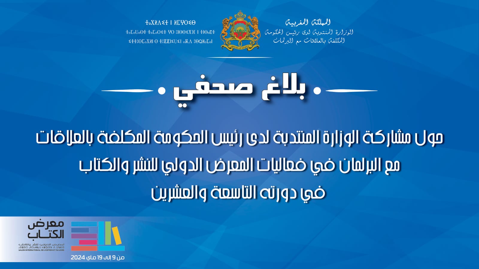 بلاغ صحفي حول مشاركة الوزارة المنتدبة لدى رئيس الحكومة المكلفة بالعلاقات مع البرلمان في فعاليات المعرض الدولي للنشر والكتاب في دورته التاسعة والعشرين