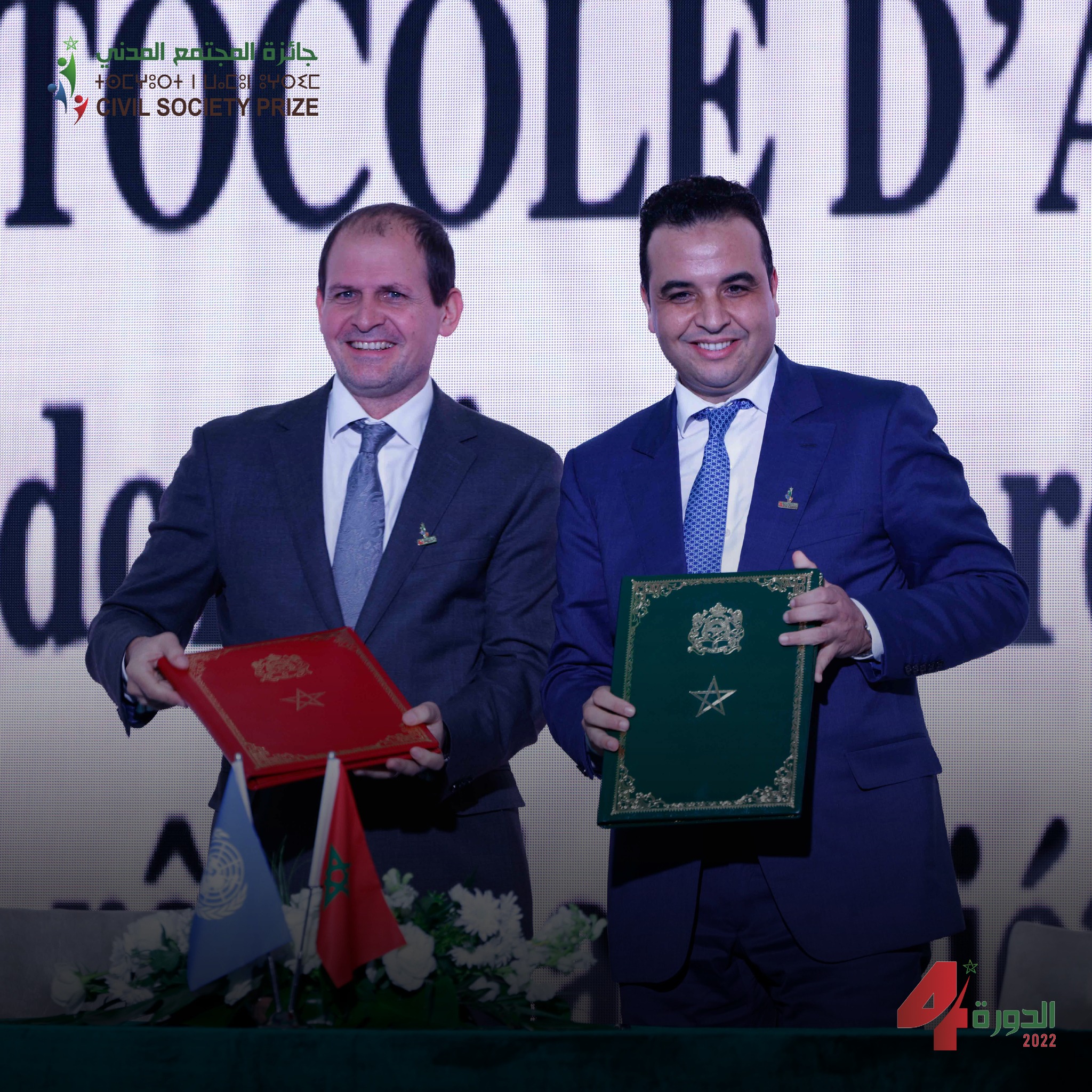 مراسيم توقيع اتفاقية شراكة بين الوزارة المنتدبة لدى رئيس الحكومة المكلفة بالعلاقات مع البرلمان وبرنامج الأمم المتحدة الإنمائي PNUD، ضمن فعاليات الدورة الرابعة لتسليم جائزة المجتمع المدني والتي جرت يوم الخميس 22 دجنبر 2022